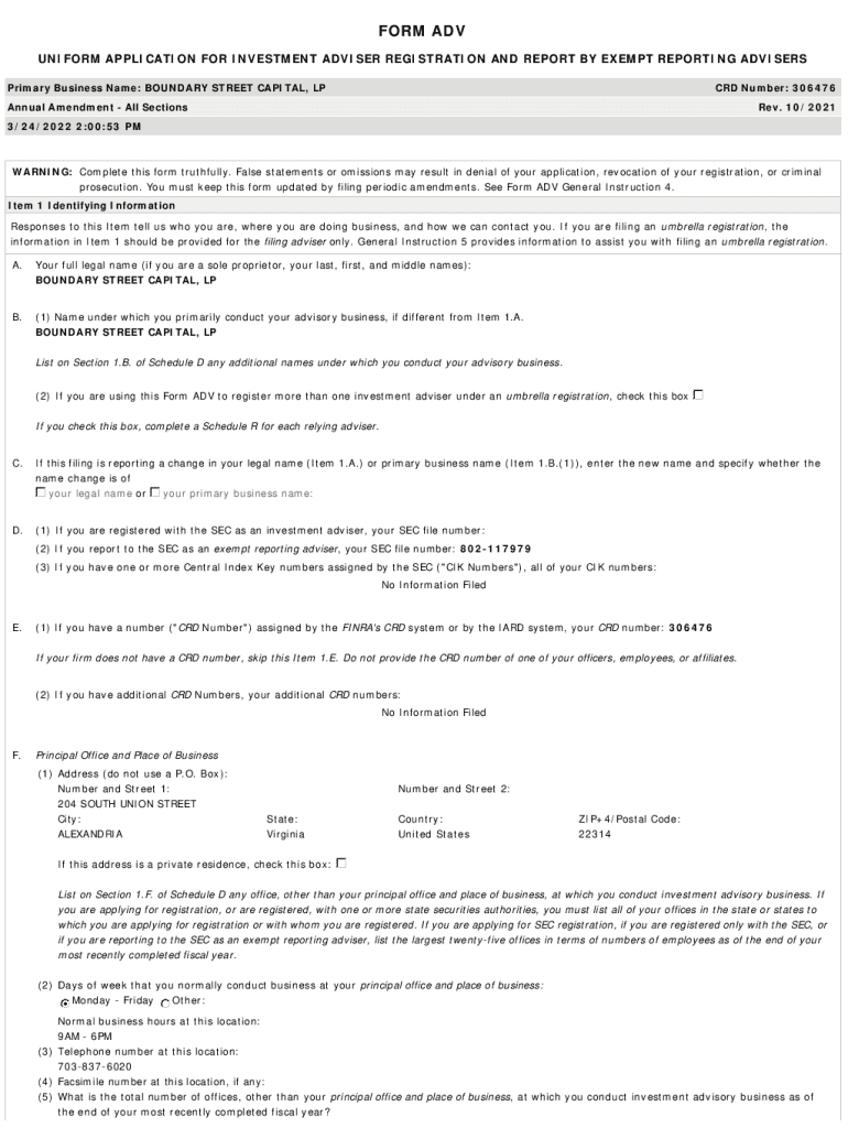 FORM ADV UNIFORM APPLICATION FOR INVESTMENT ADVISER REGISTRATION AND REPORT BY EXEMPT REPORTING ADVISERS Primary Business Name: BOUNDARY STREET CAPITAL, PCRD Number: 306476Annual Amendment All Sections