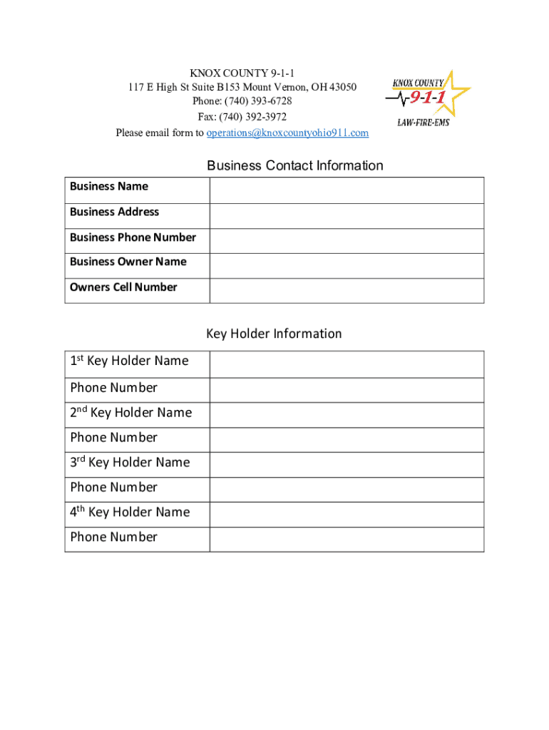 KNOX COUNTY 911 117 E High St Suite B153 Mount Vernon, OH 43050 Phone: (740) 3936728 Fax: (740) 3923972 Please email form to operations×knoxcountyohio911.business Contact Information Business Name