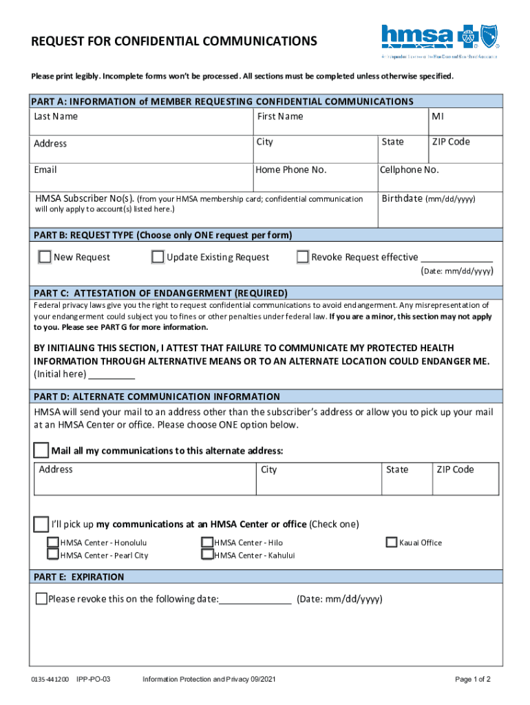 REQUEST FOR CONFIDENTIAL COMMUNICATIONS Please print legibly. Incomplete forms won't be processed. All sections must be completed unless otherwise specified. PART A: INFORMATION of MEMBER REQUESTING
