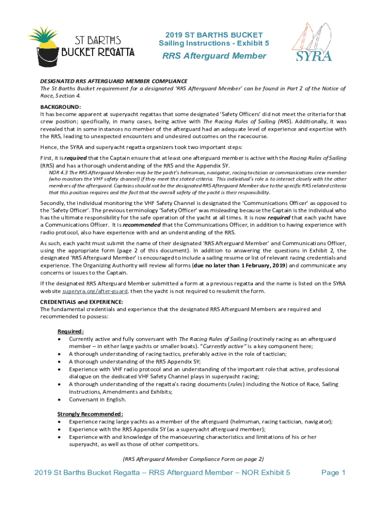 2019 ST BATHS BUCKET Sailing Instructions Exhibit 5RRS After guard Member DESIGNATED RRS AFTERWARD MEMBER COMPLIANCE The St Barth's Bucket requirement for a designated RRS After guard Member can be