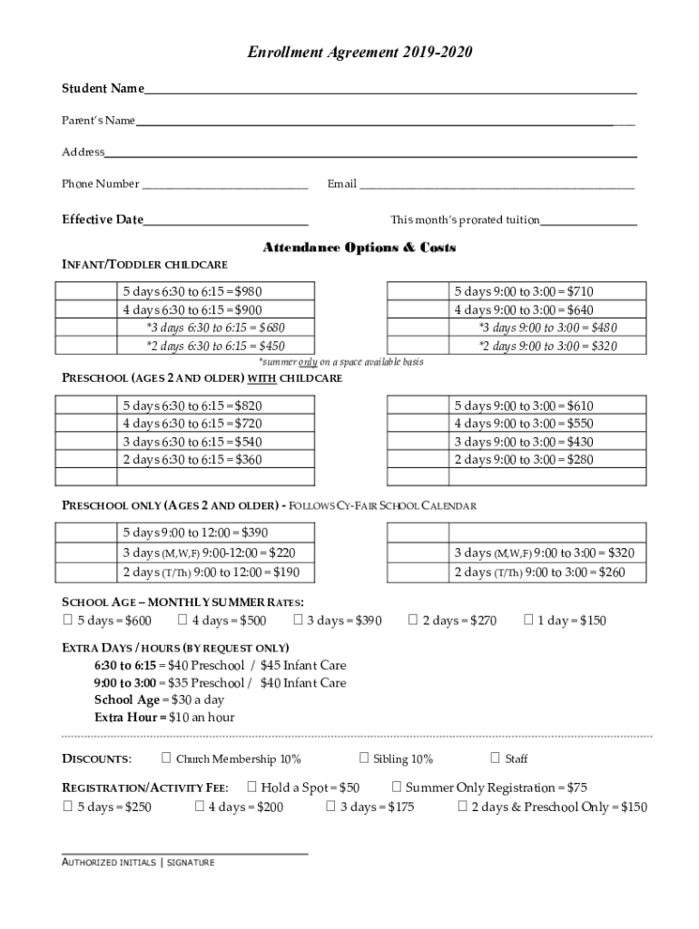 Enrollment Agreement 20192020 Student Name___Parents Name___ ___ ___Address Phone Number ___Email ___Effective Dates months prorated tuitionAttendance Options & Costs INFANT/TODDLER CHILDCARE 5 days