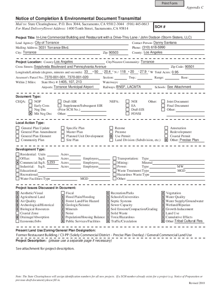 Print Form Appendix Notice of Completion & Environmental Document Transmittal Mail to: State Clearinghouse, P.O. Box 3044, Sacramento, CA 958123044 (916) 4450613 For Hand Delivery/Street Address: