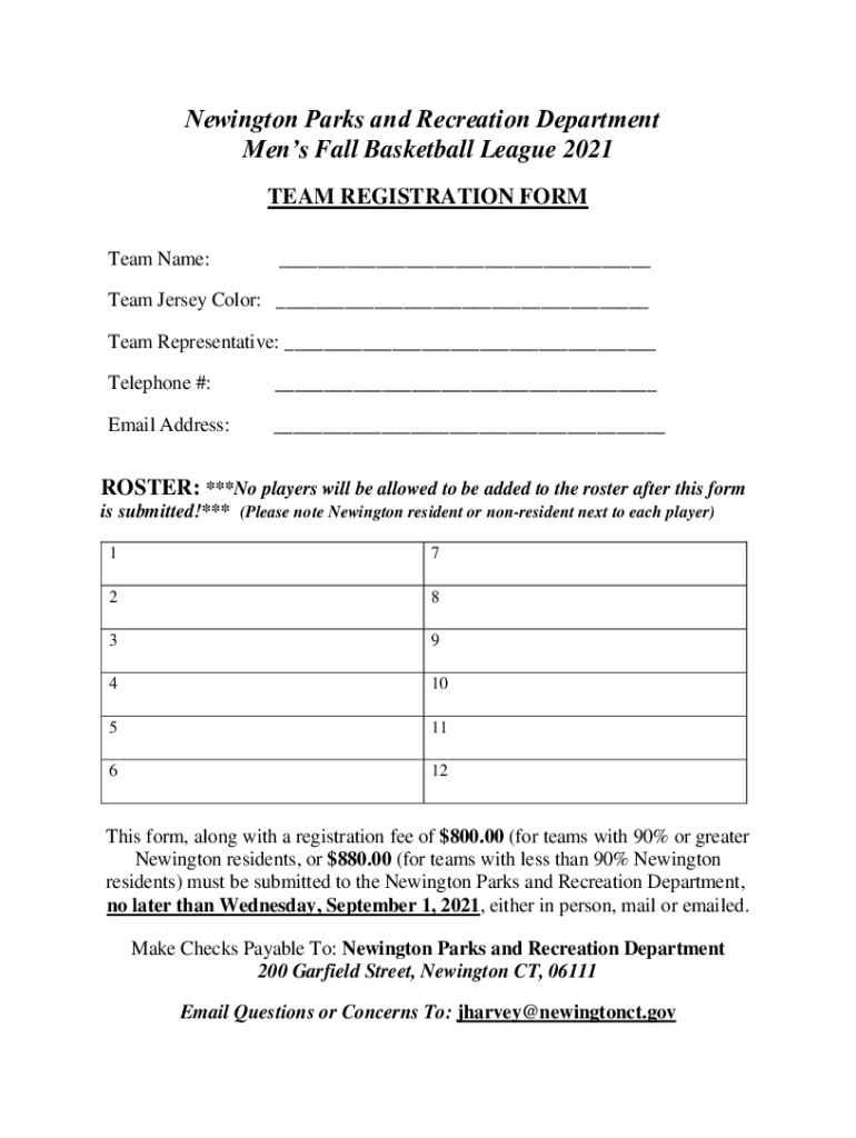 Newington Parks and Recreation Department Men Fall Basketball League 2021 TEAM REGISTRATION FORM Team Name:___Team Jersey Color: ___ Team Representative: ___ Telephone #:___Email Address:___ROSTER: