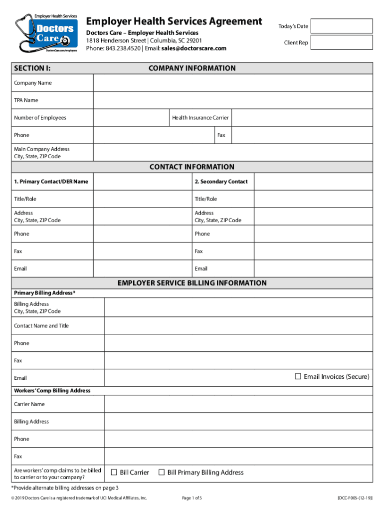 Employer Health Services Agreement Doctors Care Employer Health Services 1818 Henderson Street | Columbia, SC 29201 Phone: 843.238.4520 | Email: sales×doctor scare. Collection I:Today's Date Client
