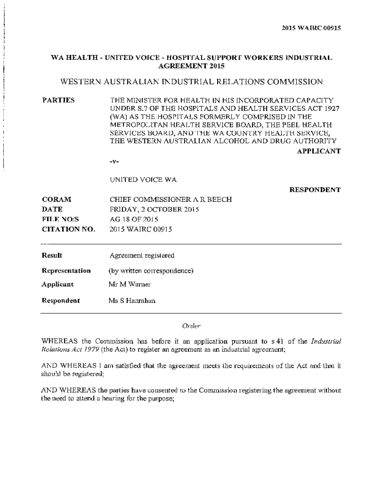 2015 Warner 00915WA HEALTH UNITED VOICE HOSPITAL SUPPORT WORKERS INDUSTRIAL AGREEMENT 2015WESTERN AUSTRALIAN INDUSTRIAL RELATIONS COMMISSION PARTIES MINISTER FOR HEALTH IN HIS INCORPORATED CAPACITY