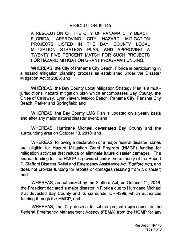 RESOLUTION 19145 A RESOLUTION OF THE CITY OF PANAMA CITY BEACH, FLORIDA, APPROVING CITY HAZARD MITIGATION PROJECTS LISTED IN THE BAY COUNTY LOCAL MITIGATION STRATEGY PLAN, AND APPROVING A TWENTY FIVE