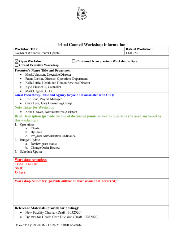 Tribal Council Workshop InformationWorkshop Title: Vowel Wellness Center Update Open Workshop Closed Executive WorkshopDate of Workshop: 11/03/20Continued from previous Workshop Date:Presenters Name,