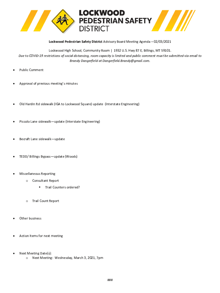 Lockwood Pedestrian Safety District Advisory Board Meeting Agenda 02/03/2021 Lockwood High School, Community Room | 1932 U.S. Hwy 87 E, Billings, MT 59101. Due to COVID-19 restrictions of social distancing,