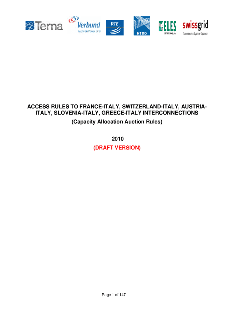 ACCESS RULES TO FRANCEITALY, SWITZERLANDITALY, AUSTRIAITALY, SLOVENIAITALY, GREECEITALY INTERCONNECTIONS (Capacity Allocation Auction Rules) 2010 (DRAFT VERSION)Page 1 of 147Section I. Introduction...................................................................................................