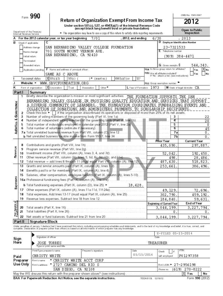 Form990OMB No. 15450047Return of Organization Exempt From Income Tax2012Under section 501(c), 527, or 4947(a)(1) of the Internal Revenue Code (except black lung benefit trust or private foundation)