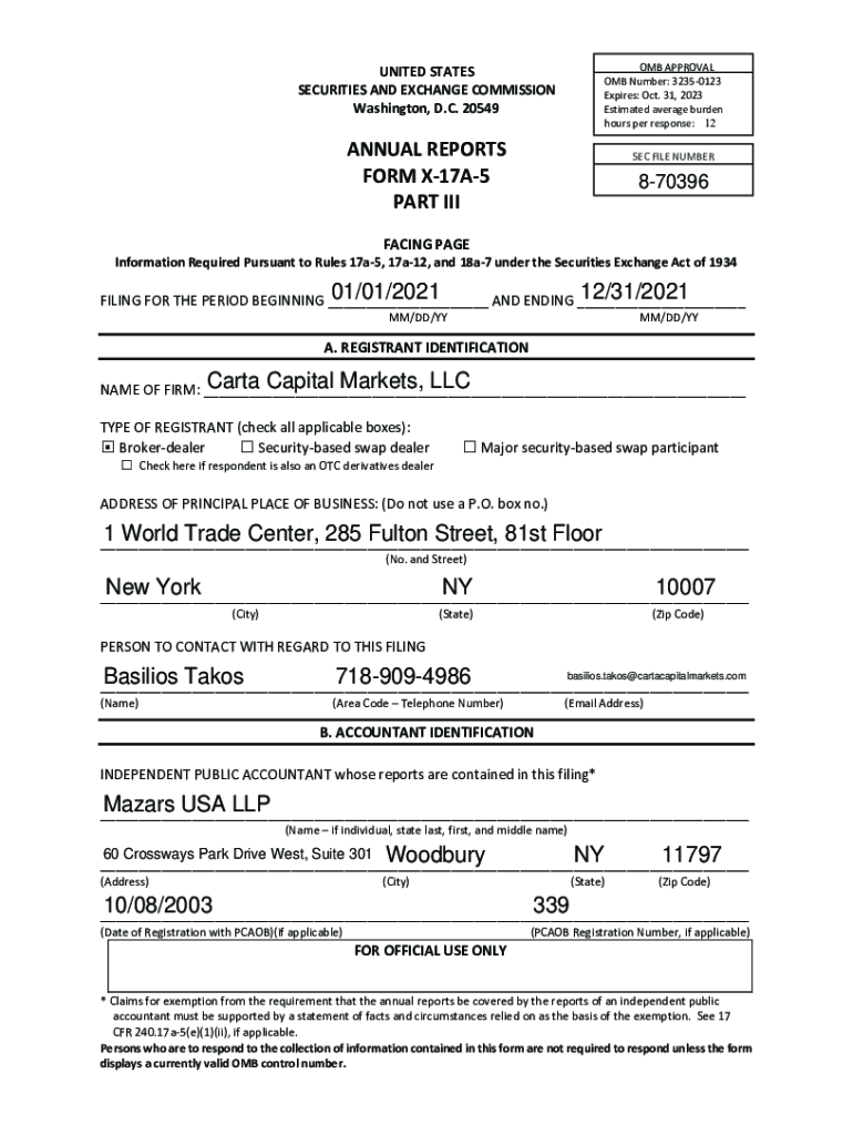CARTA Capital Markets, LLC Statement of Financial Condition and Related Footnotes SEC File Number: 870396 Form X17A5, Part III Year Ended December 31, 2021, With Report of Independent Registered Public