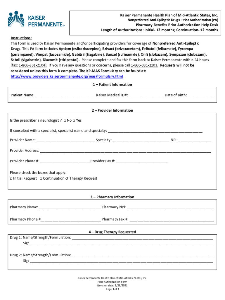 Kaiser Permanent Health Plan of mid-Atlantic States, Inc. Nonpreferred AntiEpileptic Drugs Prior Authorization (PA)Pharmacy Benefits Prior Authorization Help Desk Length of Authorizations: Initial