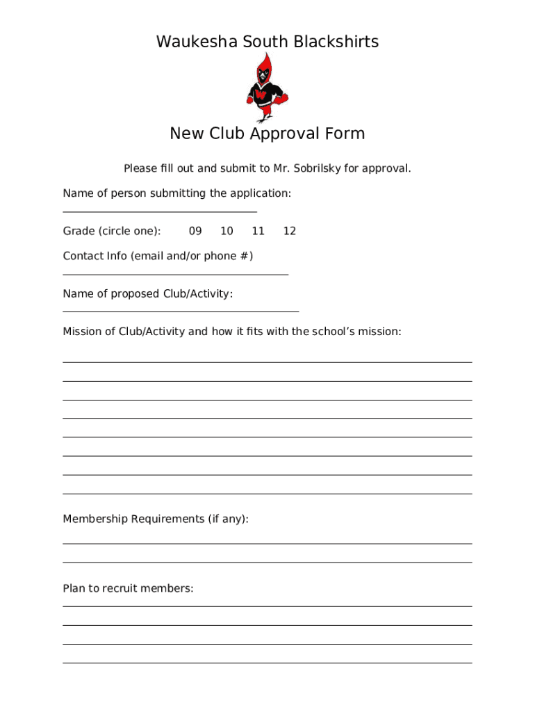 The New Club Approval is a Word document needed to be submitted to the specific address to provide certain info. It has to be completed and signed, which can be done in hard copy, or using a particular software such as PDFfiller. It helps to complete any PDF or Word document right in the web, customize it depending on your needs and put a legally-binding electronic signature. Right away after completion, you can send the New Club Approval to the relevant person, or multiple recipients via email or fax. The template is printable too thanks to PDFfiller feature and options presented for printing out adjustment. Both in electronic and in hard copy, your form should have a neat and professional outlook. You may also turn it into a template to use later, so you don't need to create a new blank form again. All you need to do is to customize the ready document.