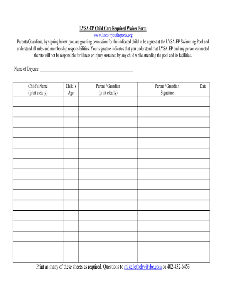 LYSES Child Care Required Waiver Form www.lincolnyouthsports.org Parents/Guardians, by signing below, you are granting permission for the indicated child to be a guest at the LYSES Swimming Pool and