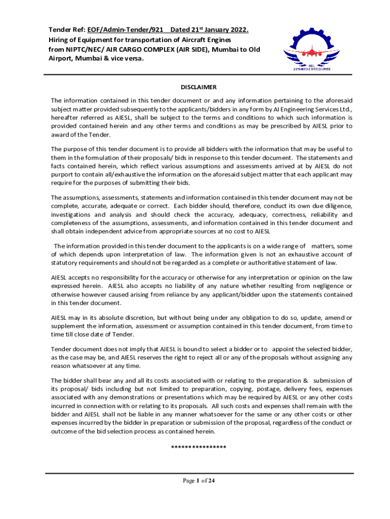 Tender Ref: EOF/AdminTender/921 Dated 21st January 2022. Hiring of Equipment for transportation of Aircraft Engines from NI PTC/NEC/ AIR CARGO COMPLEX (AIR SIDE), Mumbai to Old Airport, Mumbai & vice