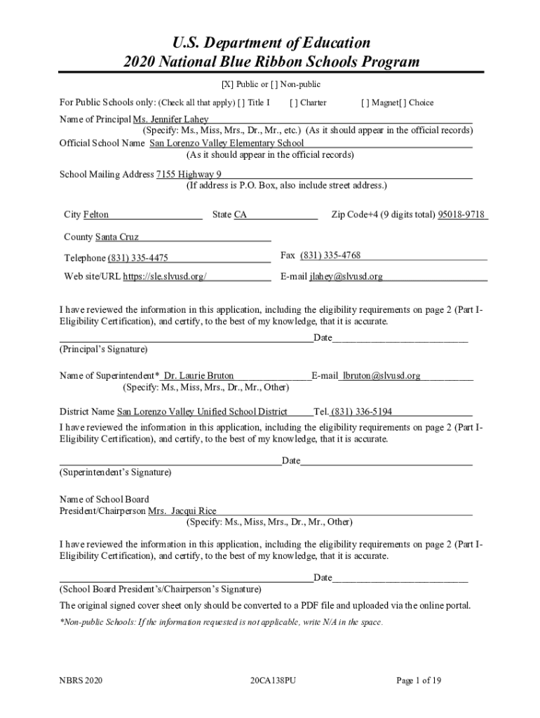 U.S. Department of Education 2020 National Blue Ribbon Schools Program [X] Public or [ ] Nonpublic Public Schools only: (Check all that apply) [ ] Title I[ ] Charter[ ] Magnet[ ] ChoiceName of Principal