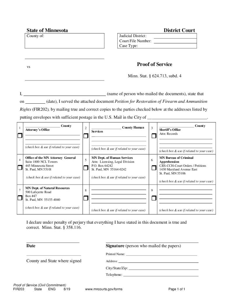 State of MinnesotaDistrict Courteously of:Judicial District: Court File Number: Case Type:Proof of ServicevsMinn. Stat. 624.713, sub. 4I,(name of person who mailed the documents), state that on(date),