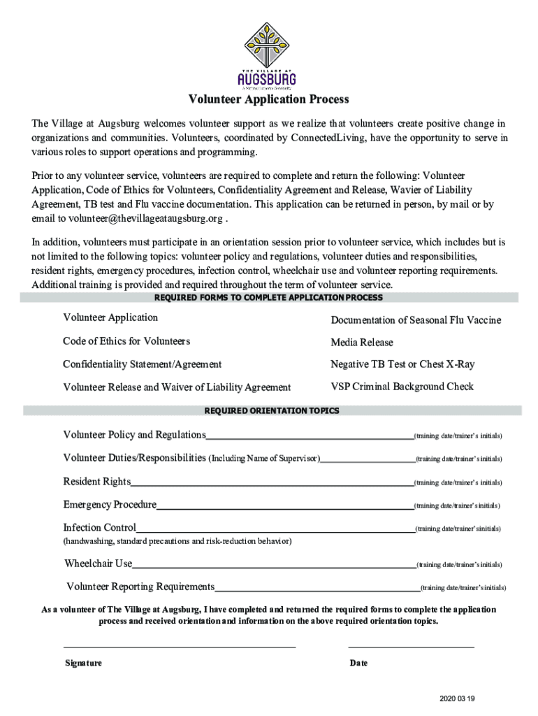 Volunteer Application Process The Village at Augsburg welcomes volunteer support as we realize that volunteers create positive change in organizations and communities. Volunteers, coordinated by ConnectedLiving,
