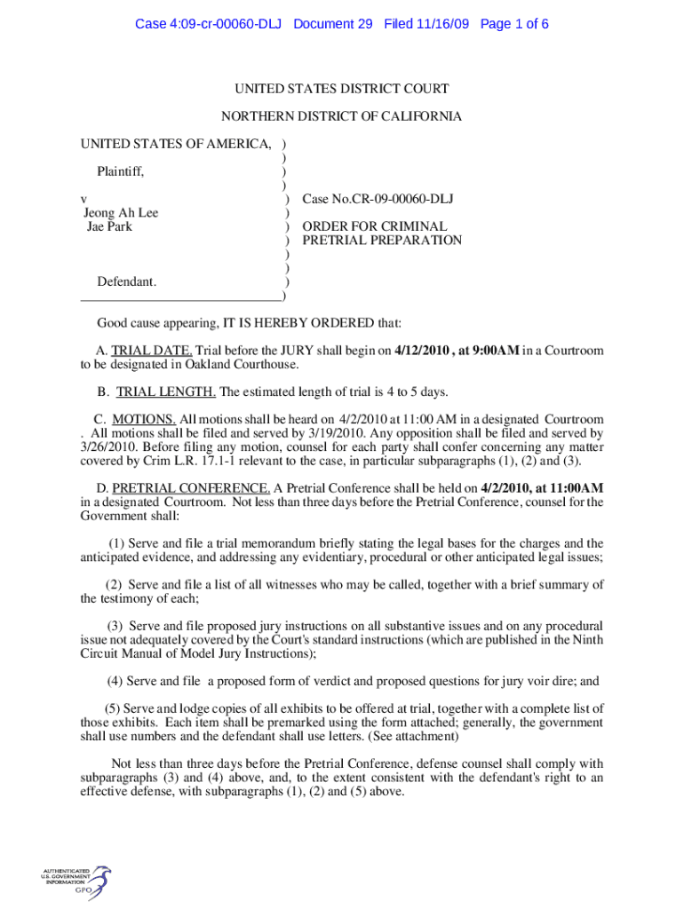 Case 4:09cr00060DLJ Document 29 Filed 11/16/09-Page 1 of 6UNITED STATES DISTRICT COURT NORTHERN DISTRICT OF CALIFORNIA UNITED STATES OF AMERICA,) ) Plaintiff,) ) v) Case No.CR0900060DLJ Along Ah Lee)