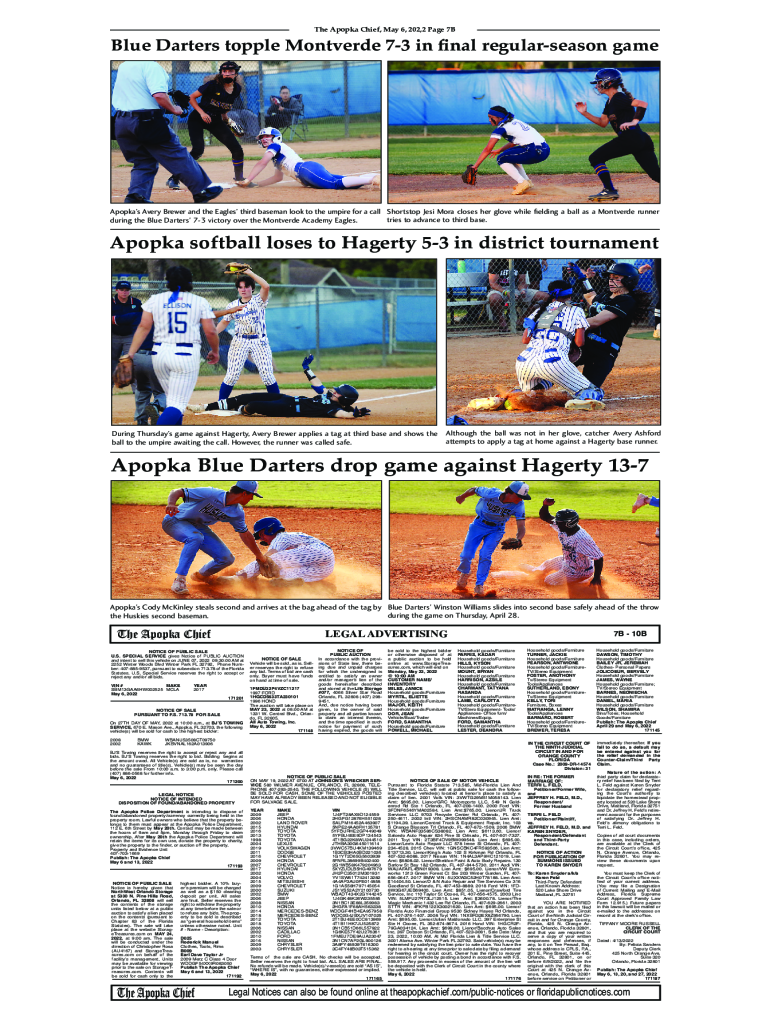 The Apopka Chief, May 6, 202,2 Page 7BBlue Darters topple Monteverde 73 in final regular season gameApopkas Avery Brewer and the Eagles third baseman look to the umpire for a call Shortstop Jedi Morey