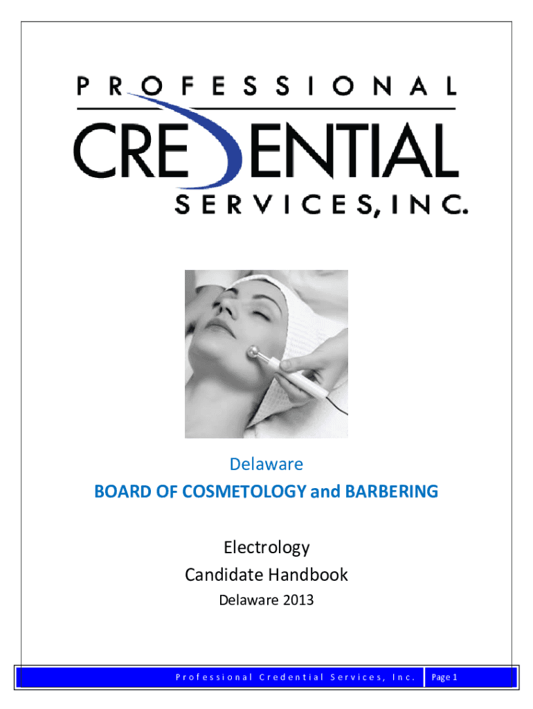 Delaware BOARD OF COSMETOLOGY and BARBERING Electrolyte Candidate Handbook Delaware 2013Professional Credential Services, Inc. Page 1Quick Reference STEP ONE: COMPLETE ONLINE APPLICATION Read Candidate