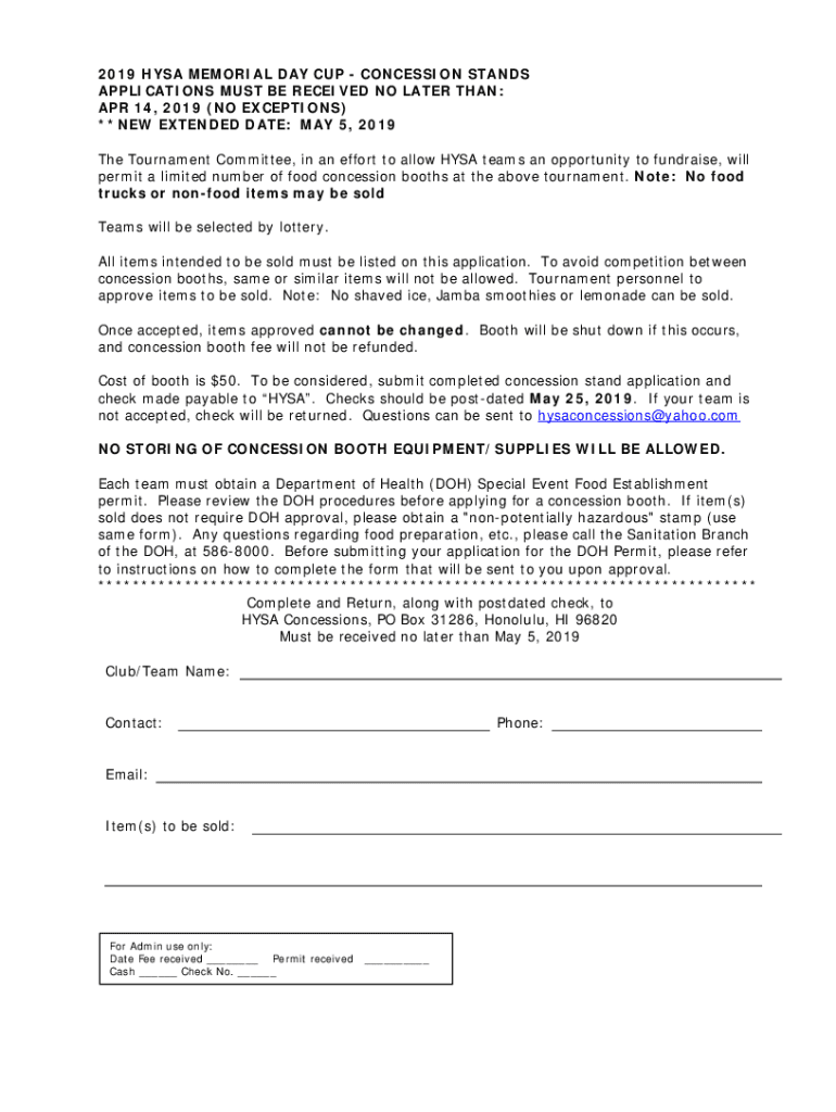 2019 HSA MEMORIAL DAY CUP CONCESSION STANDS APPLICATIONS MUST BE RECEIVED NO LATER THAN: APR 14, 2019 (NO EXCEPTIONS) **NEW EXTENDED DATE: MAY 5, 2019, The Tournament Committee, in an effort to allow