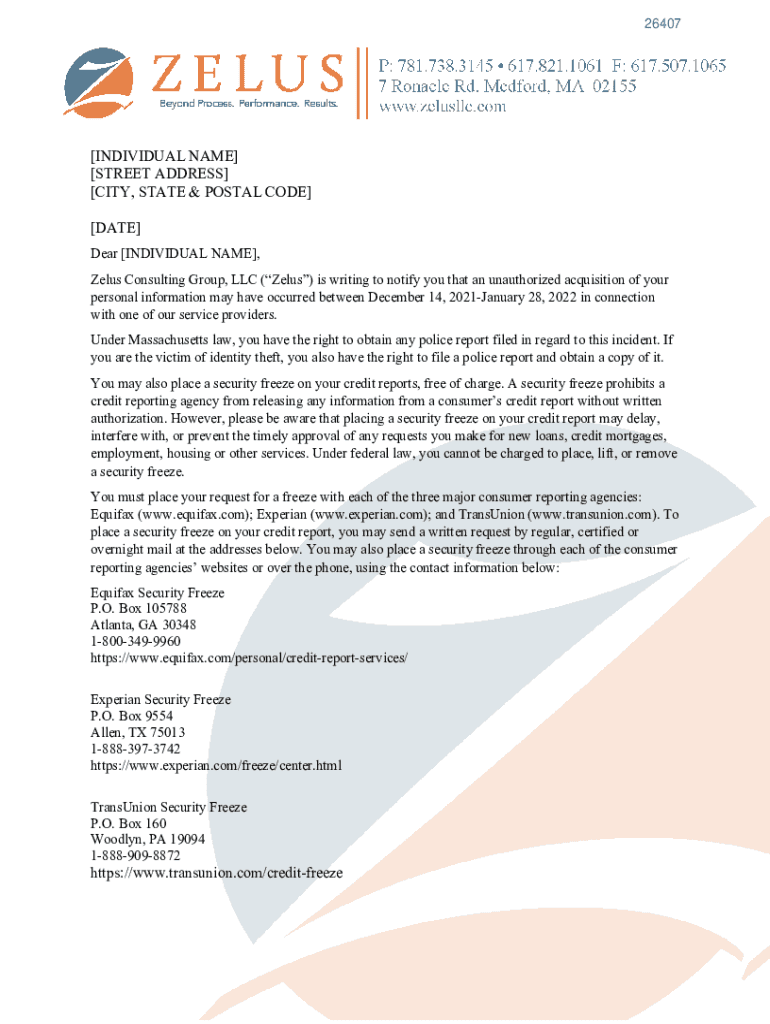 26407×INDIVIDUAL NAME] [STREET ADDRESS] [CITY, STATE & POSTAL CODE] [DATE] Dear [INDIVIDUAL NAME×, Zeus Consulting Group, LLC (Zeus) is writing to notify you that an unauthorized acquisition of