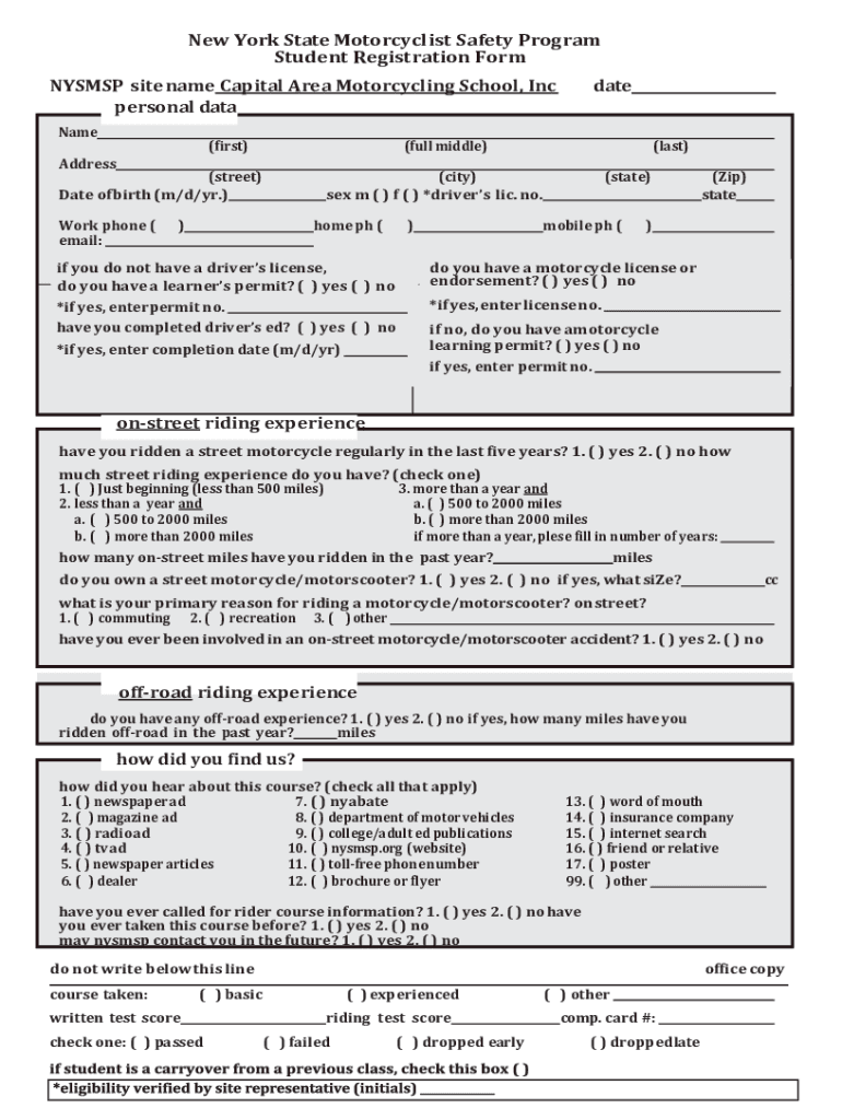 New York State Motorcyclist Safety Program Student Registration Form NESTS site name Capital Area Motorcycling School, Inc personal data Name(first)Address(full middle)(street) Date of birth (m/d/yr.)