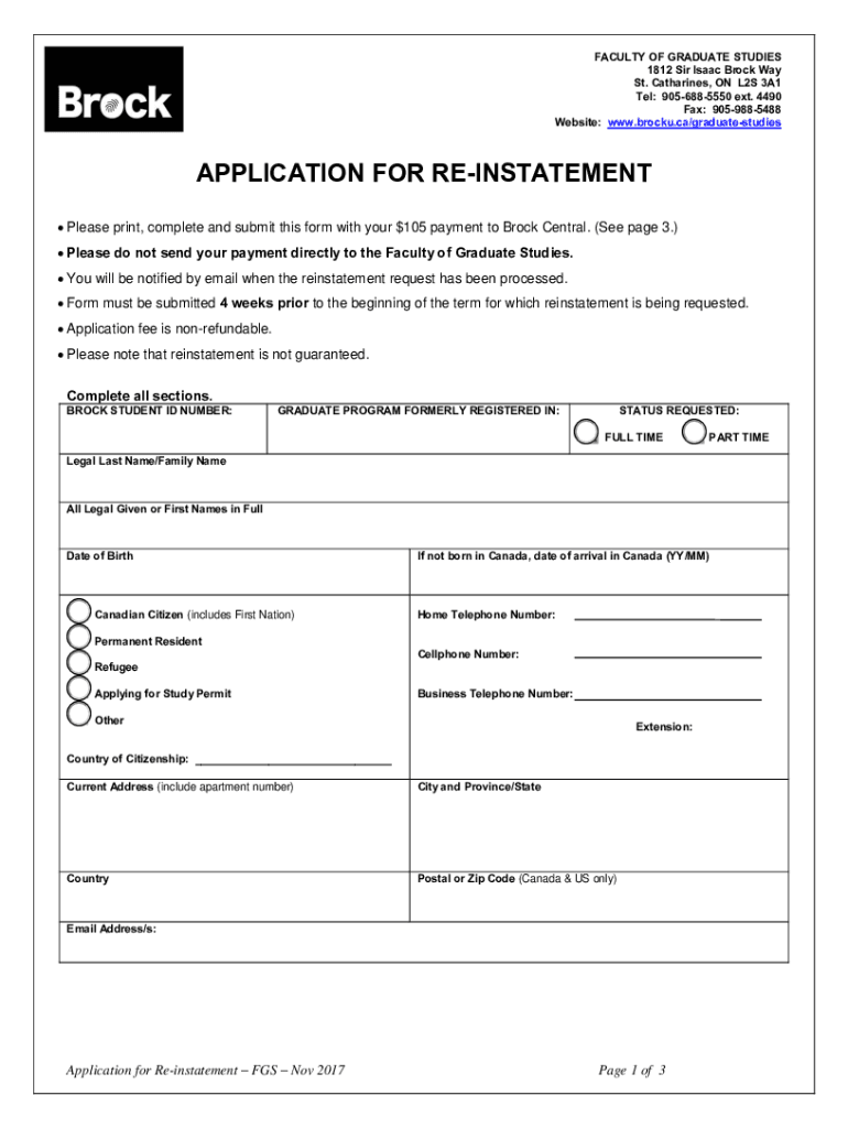 FACULTY OF GRADUATE STUDIES 1812 Sir Isaac Brock Way St. Catharines, ON L2S 3A1 Tel: 9056885550 ext. 4490 Fax: 9059885488 Website: www.brocku.ca/graduatestudiesAPPLICATION FOR REINSTATEMENT Please