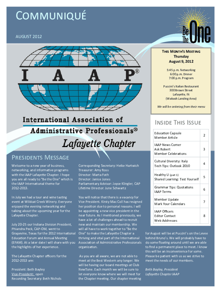 Communiqué AUGUST 2012 This Month's Meeting Thursday, August 9, 2012 5:45 p.m. Networking 6:00 p.m. Dinner 7:00 p.m. Program Puccini\'s Italian Restaurant 300 Brown Street Lafayette, IN (Wabash Landing