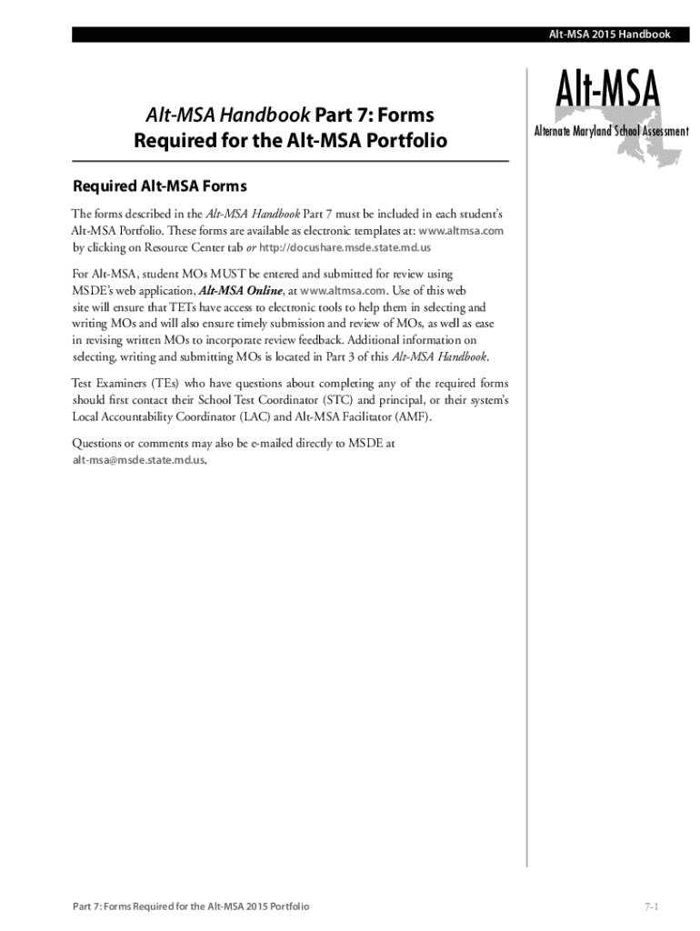 Alt MSA 2015 HandbookAltMSA Handbook Part 7: Forms Required for the Alt MSA PortfolioAltMSA Alternate Maryland School AssessmentRequired Alt MSA Forms The forms described in the Alt MSA Handbook Part