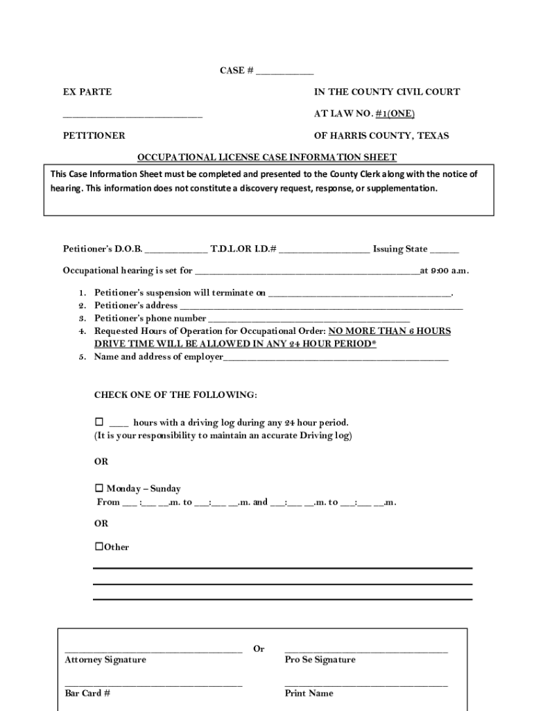 CASE # ___ EX PART EIN THE COUNTY CIVIL COURT___AT LAW NO. #1(ONE)PETITIONER HARRIS COUNTY, TEXAS OCCUPATIONAL LICENSE CASE INFORMATION SHEETThisThis Case Information SheetSheet must be completed