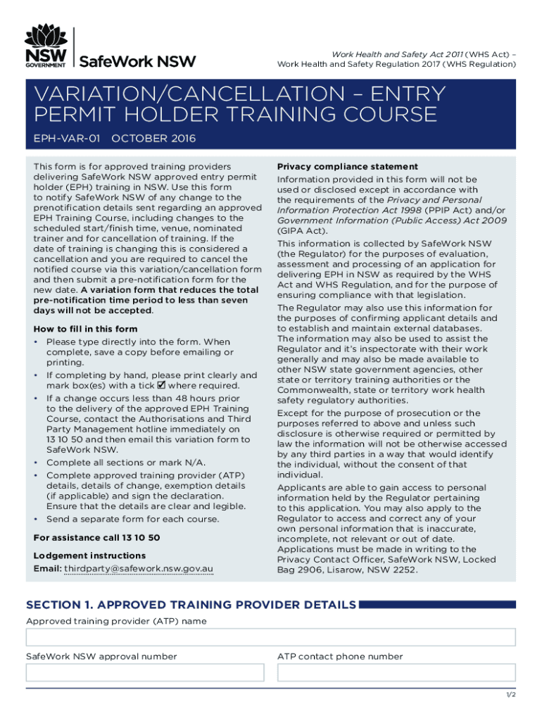 Work Health and Safety Act 2011 (WHS Act) Work Health and Safety Regulation 2017 (WHS Regulation)VARIATION/CANCELLATION ENTRY PERMIT HOLDER TRAINING COURSE EPHVAR01OCTOBER 2016 This form is for approved