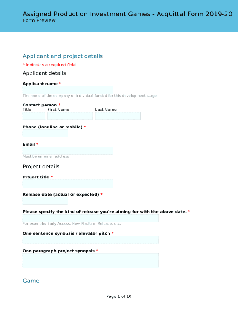 Assigned Production Investment Games Acquittal Form 201920 Form PreviewApplicant and project details * indicates a required applicant details Applicant name *The name of the company or individual