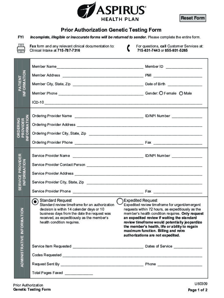Reset Formation Authorization Genetic Testing Form Incomplete, illegible or inaccurate forms will be returned to sender. Please complete the entire form. Fax form and any relevant clinical documentation