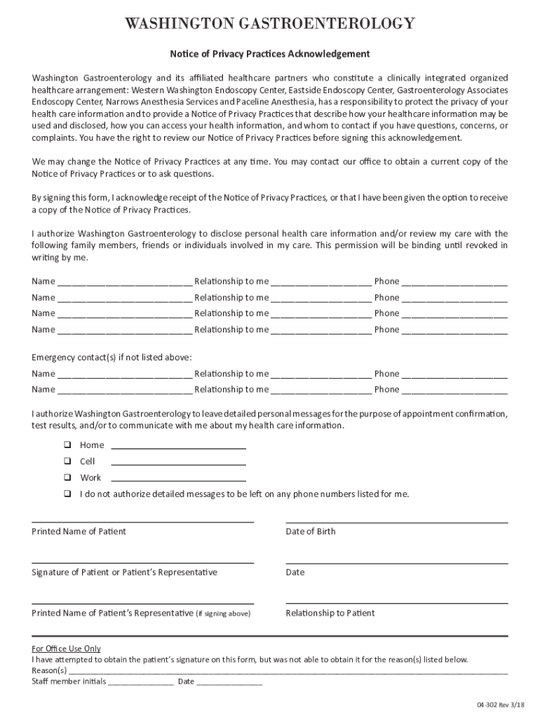 Notice of Privacy Practices Acknowledgement Washington Gastroenterology and its affiliated healthcare partners who constitute a clinically integrated organized healthcare arrangement: Western Washington