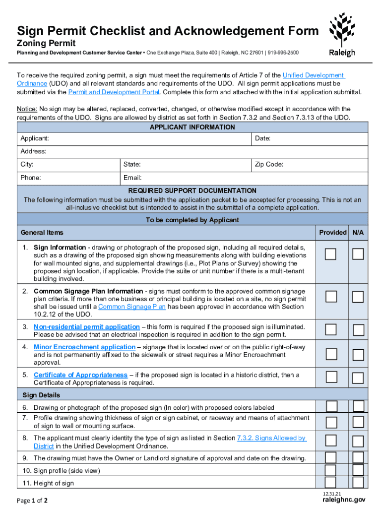 Sign Permit Checklist and Acknowledgement Form Zoning PermitPlanning and Development Customer Service Center One Exchange Plaza, Suite 400 | Raleigh, NC 27601 | 9199962500To receive the required zoning