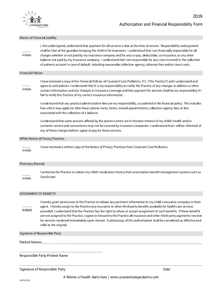 2019 Authorization and Financial Responsibility Form Waiver of Financial Liability___ Initials, the undersigned, understand that payment for all services is due at the time of service. Responsibility
