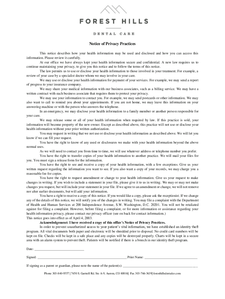 Notice of Privacy Practices This notice describes how your health information may be used and disclosed and how you can access this information. Please review it carefully. At our office we have always
