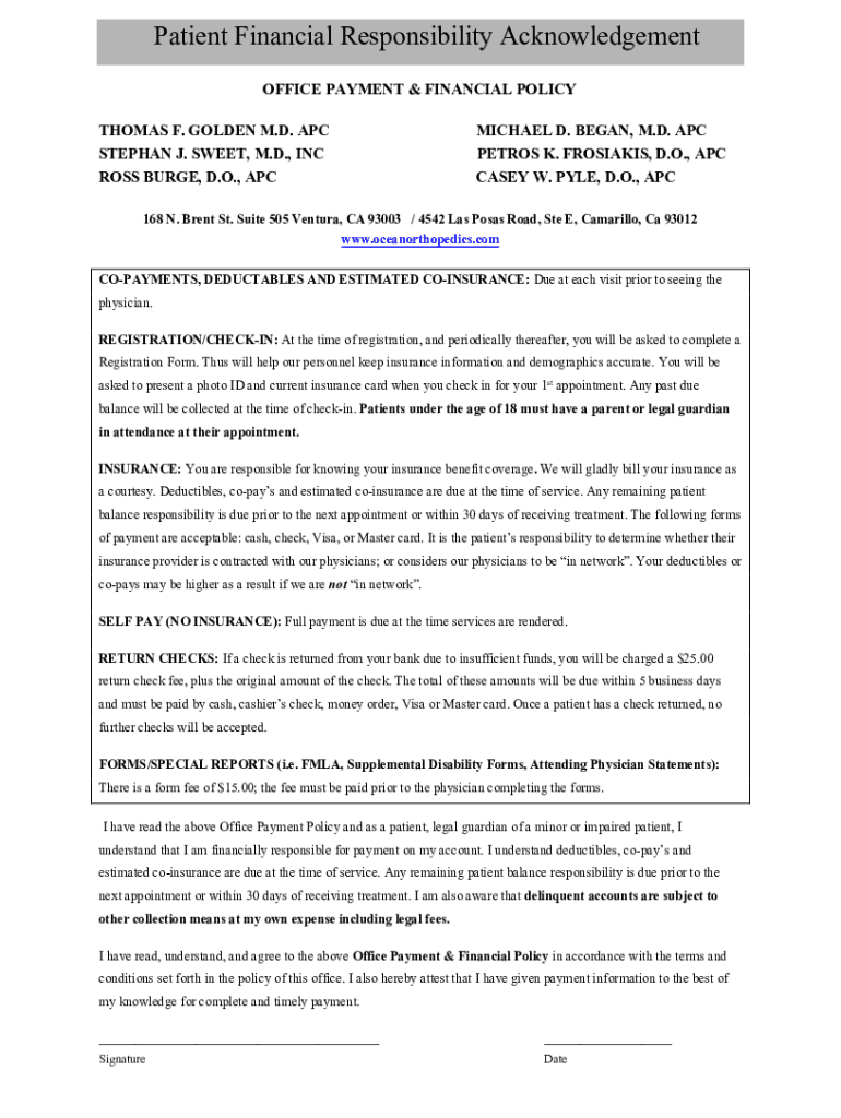 Patient Financial Responsibility Acknowledgement OFFICE PAYMENT & FINANCIAL POLICY THOMAS F. GOLDEN M.D. APC STEPHAN J. SWEET, M.D., INC ROSS BURKE, D.O., MICHAEL D. BEGAN, M.D. APC METROS K. FRISIANS,