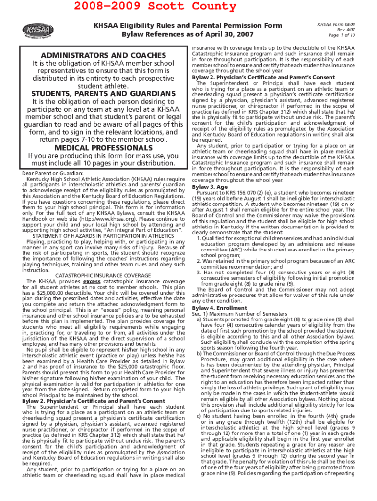 20082009 Scott County KHS AA Eligibility Rules and Parental Permission Form Bylaw References as of April 30, 2007ADMINISTRATORS AND COACHES It is the obligation of KHS AA member school representatives