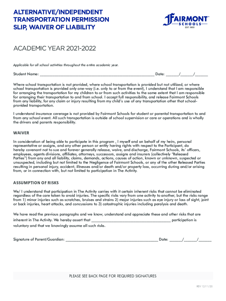 ALTERNATIVE/INDEPENDENT TRANSPORTATION PERMISSION SLIP, WAIVER OF LIABILITY ACADEMIC YEAR 20212022 Applicable for all school activities throughout the entire academic year. Student Name: ___ Date: