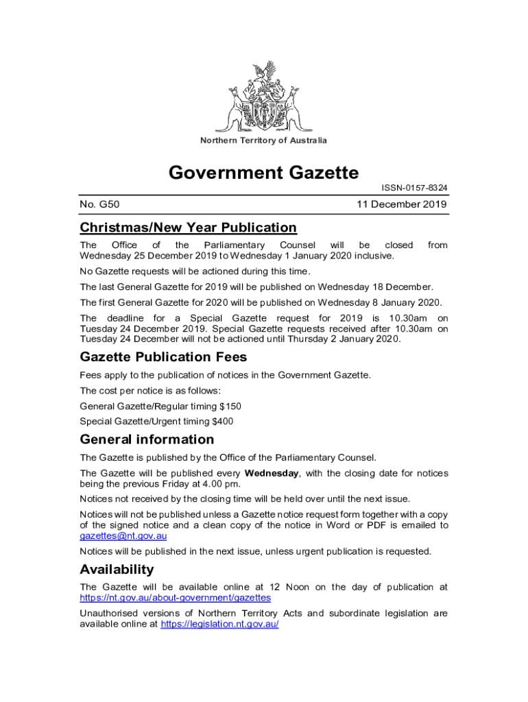 Northern Territory of AustraliaGovernment Gazette No. G50ISSN0157832411 December 2019Christmas/New Year Publication The Office of the Parliamentary Counsel will be closed Wednesday 25 December 2019