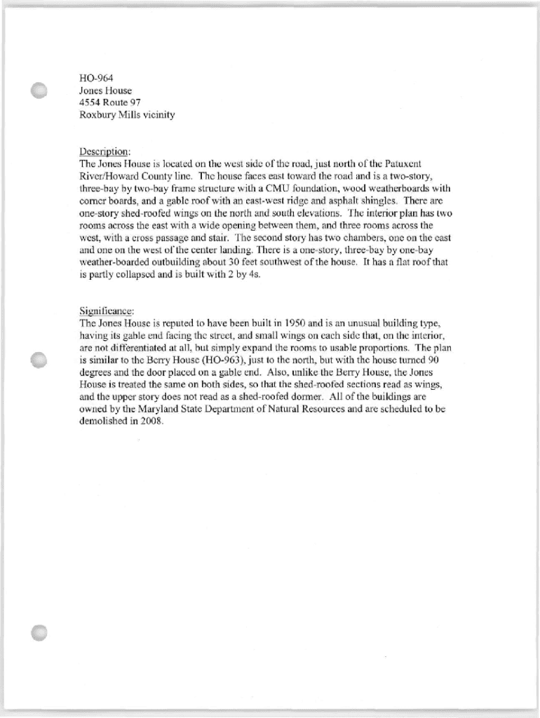 HO964 Jones House 4554 Route 97 Roxbury Mills vicinityDescription: The Jones House is located on the west side of the road, just north of the Patent River/Howard County line. The house faces east