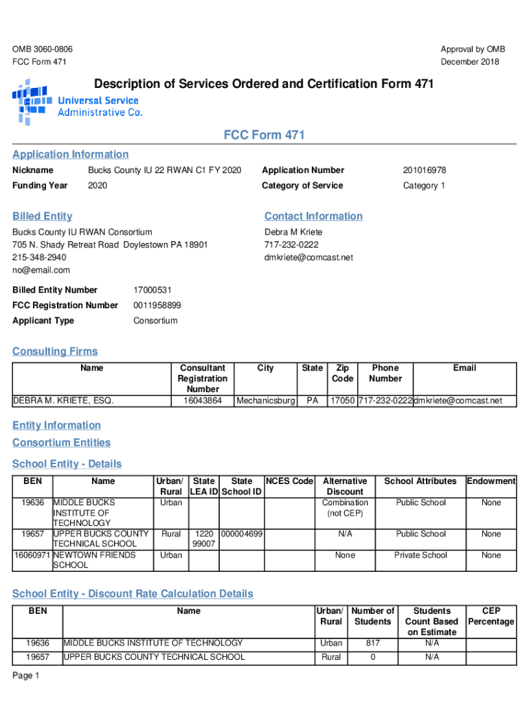 OMB 30600806 FCC Form 471Approval by OMB December 2018Description of Services Ordered and Certification Form 471FCC Form 471 Application Information NicknameBucks County IU 22 RAN C1 FY 2020Application