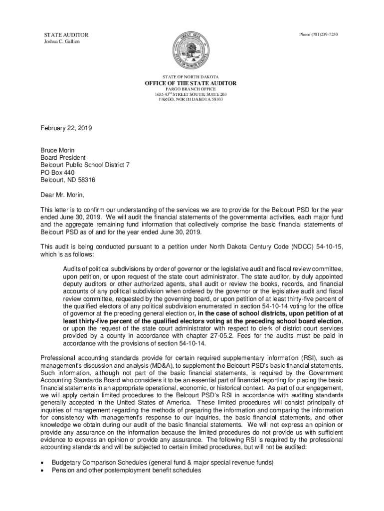 Phone (701)2397250STATE AUDITOR Joshua C. GallionSTATE OF NORTH DAKOTAOFFICE OF THE STATE AUDITOR FARGO BRANCH OFFICE 1655 43rd STREET SOUTH, SUITE 203 FARGO, NORTH DAKOTA 58103February 22, 2019Bruce