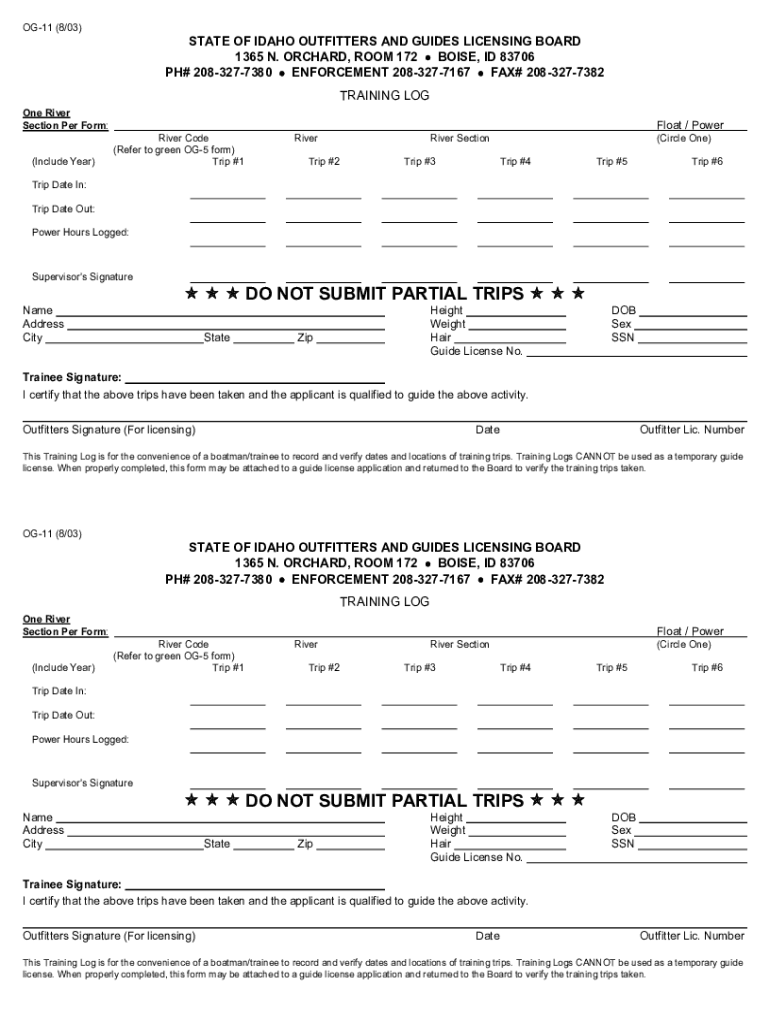 OG11 (8/03)STATE OF IDAHO OUTFITTERS AND GUIDES LICENSING BOARD 1365 N. ORCHARD, ROOM 172 BOISE, ID 83706 PH# 2083277380 ENFORCEMENT 2083277167 FAX# 2083277382 TRAINING LOG One River Section Per Form: