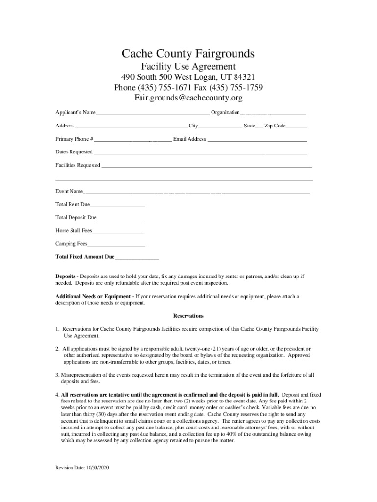 Cache County Fairgrounds Facility Use Agreement 490 South 500 West Logan, UT 84321 Phone (435) 7551671 Fax (435) 7551759 Fair. Grounds@cache county.org Applicants Name___ Organization___ Address ___City___