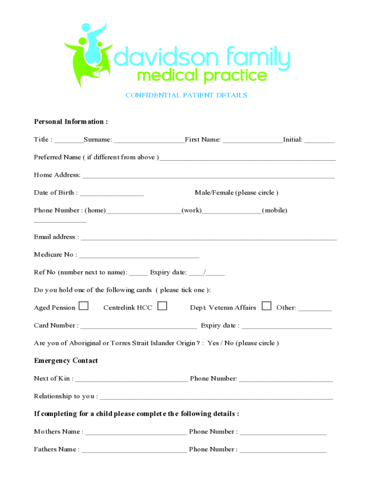 CONFIDENTIAL PATIENT DETAILSPersonal Information : Title : ___Surname: ___First Name: ___Initial: ___ Preferred Name (if different from above)___ Home Address: ___ Date of Birth : ___Male/Female (please