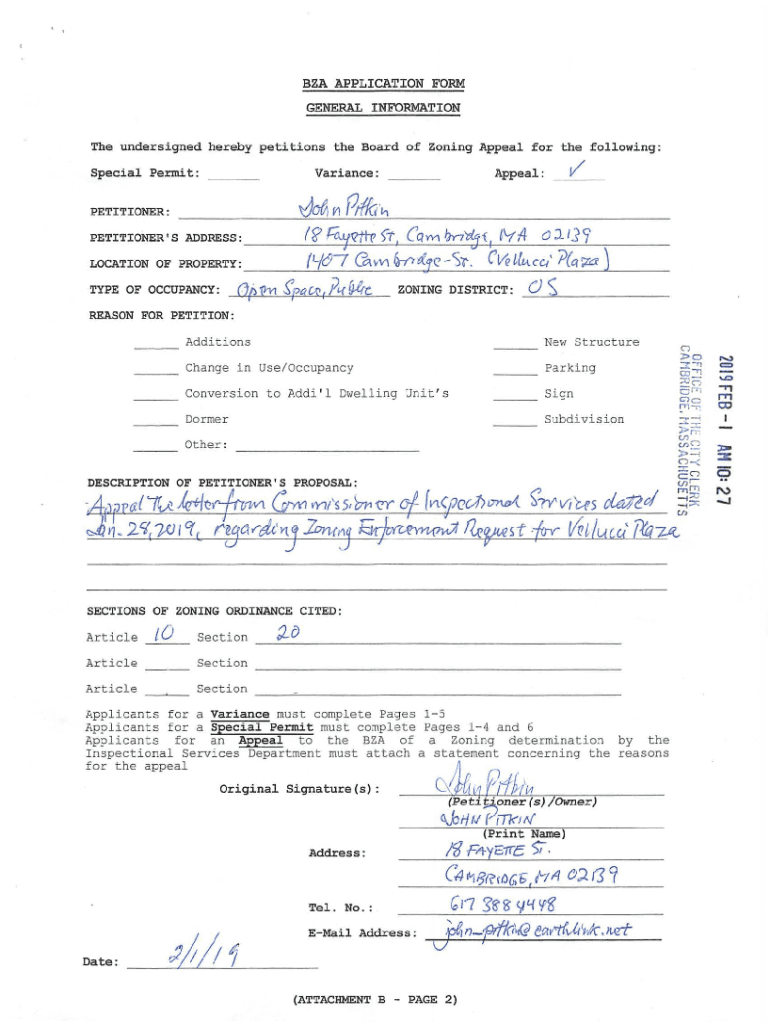 BZA APPLICATION FORM GENERAL INFORMATION The undersigned hereby petitions the Board of Zoning Appeal for the following : Special Permit :Variance :Appeal :PETITIONER: PETITIONER\'S ADDRESS :_ _ _